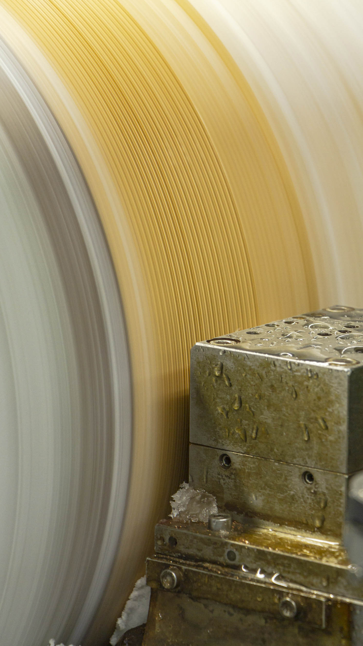 たとえば24金は、非常に純度が高く柔らかい一方で、重くて滑りにくいという特徴があります。プラチナは粘りが強く、工具側にまとわりつくような切削感があり、条件を少し間違えるとすぐに不具合が発生することもあります。編み機の部品やカットバイトへの負担が大きく、K18に比べて数十倍のスピードで摩耗が進みます。