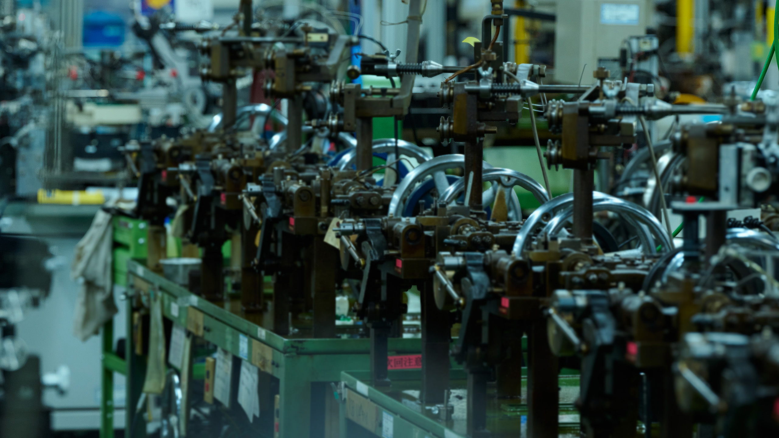工場の一角に広がるマシンチェーンのフロアには、数百台の編み機がずらりと並びます。すべてが一斉に動くわけではありませんが、小豆チェーンや喜平、その他にも多彩なチェーンが同時並行で生まれています。