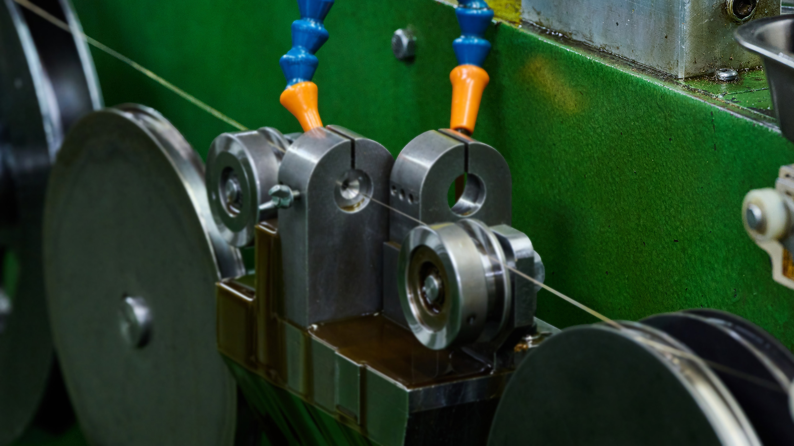 桑山のマシンチェーンは、一本の「線」作りから始まります。まずは溶解工程で金やプラチナのインゴットをつくり、それを何度も伸ばしては絞る「線引き」によって、目的の太さまで整えていきます。許容差は0.001〜0.003mmといった世界。ここでわずかに太さや硬さがずれるだけで、その後の編み機やカット工程に大きな影響が出るため、線引きの精度は品質の土台そのものです。