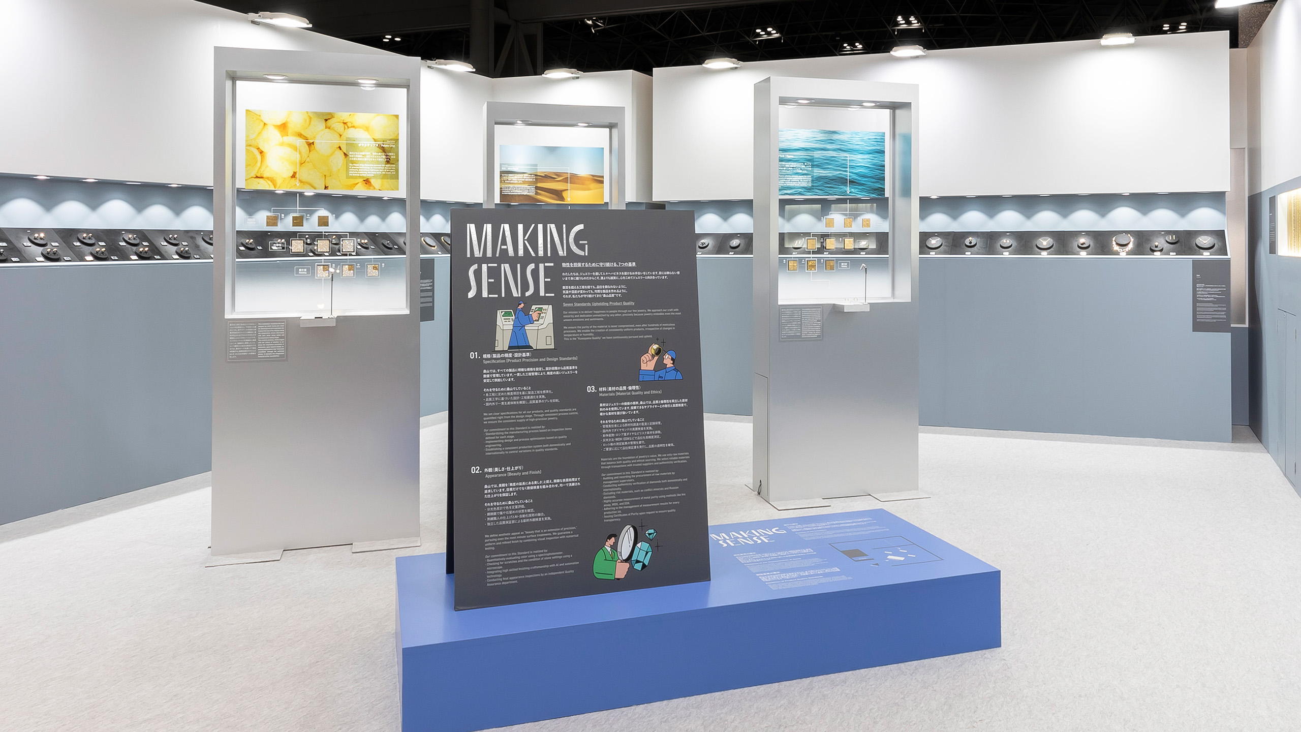 今回の展示では、物性と感性それぞれの要素の一部を取り上げて体系化し、その融合から生まれるデザインや製品の多様性を体感いただくことを意図しました。 「感性だけ」「技術だけ」ではなく、両者が噛み合うことで立ち上がる“桑山だから形にできるよいジュエリー”を、実物と体験で共有する。それが「MAKING SENSE」というテーマに込められた想いです。