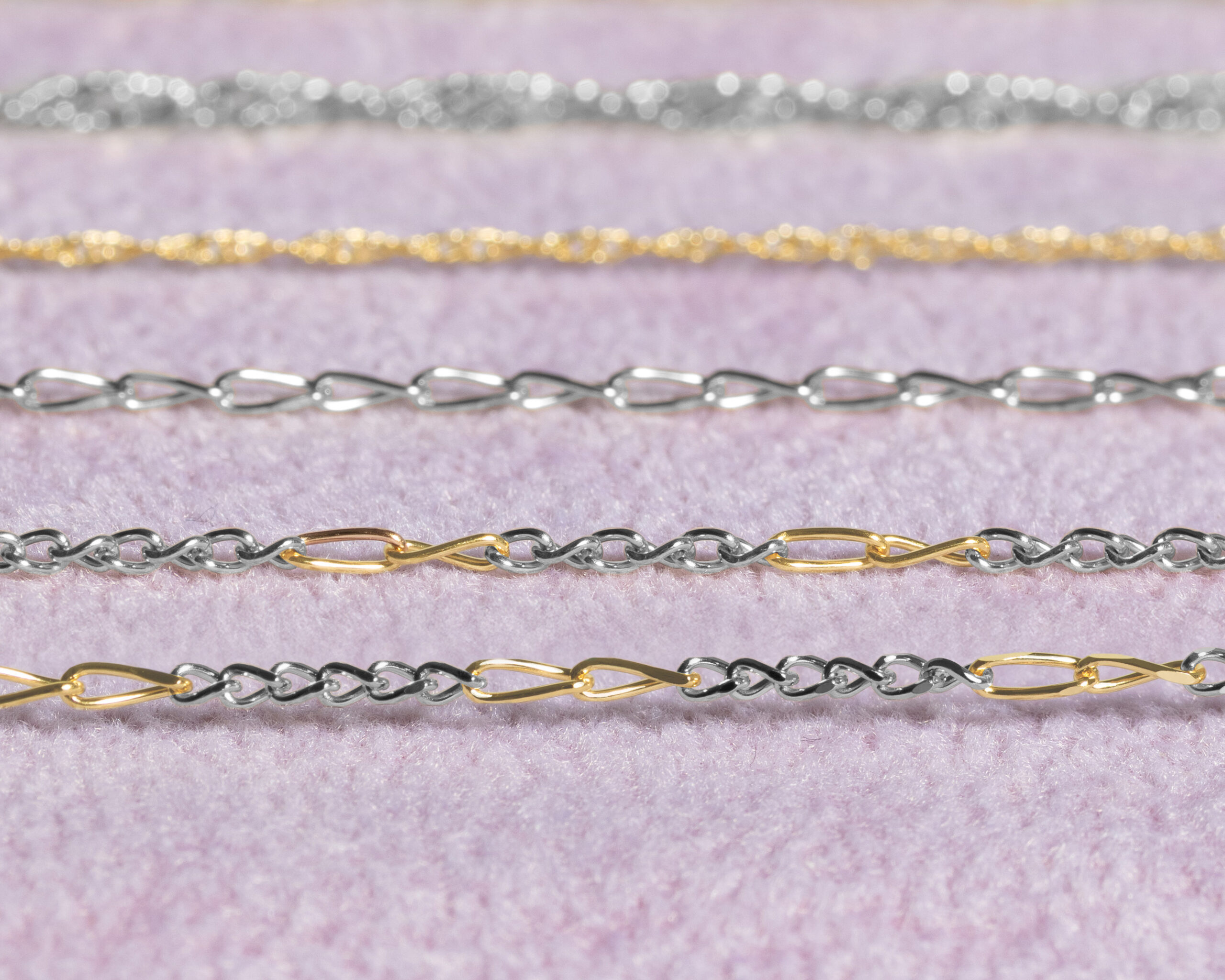▲ プラチナとK18の2種類の金種を用いたタネルチェーン。