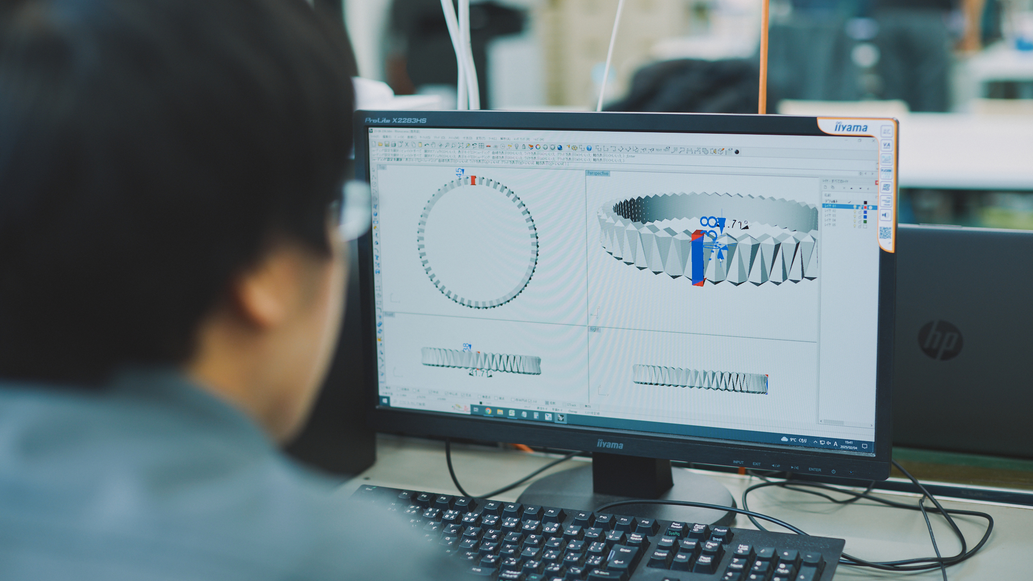 桑山では、ラフ画で来たデザインも一度イラストレーターやCADに起こし、寸法や角度を数値として整理し直します。これは、後のCNCプログラムを組むためだけではなく、営業やデザイナーと「この角度はこれくらい」などと共通の言語で会話するためでもあります。正面図と側面図の描き方が矛盾している場合は、「実際に作るとこう見えます」と3Dモデルでイメージを共有し、企画段階からズレを修正していきます。ここでの対話が「企画品質」の要であり、後戻りの少ない開発フローを支えています。